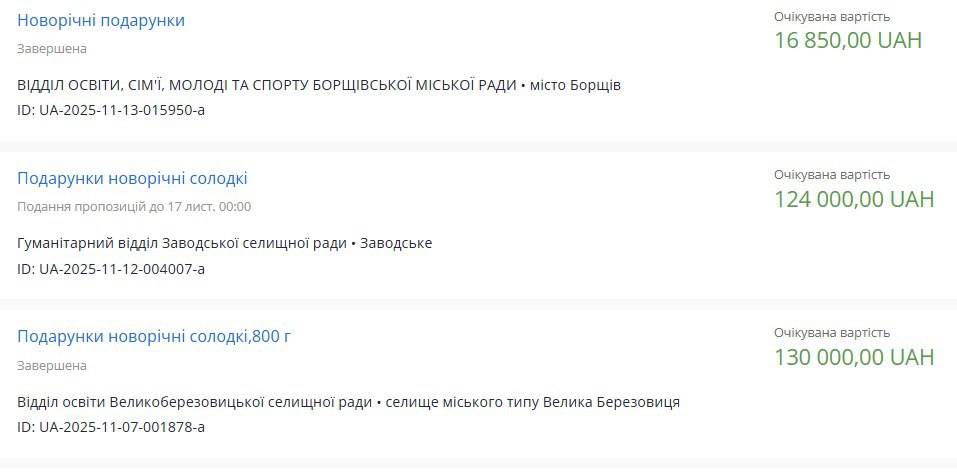 Тендери стосуються закупівлі солодких подарунків, іграшок та святкових наборів. Усі процедури — відкриті, з очікуваною вартістю, визначеною замовниками.