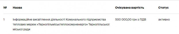 При чому до цієї схеми залучаються такі комунпідприємтва, які раніше ніколи не витрачали коштів на подібного роду послуги. Наприклад, маємо чергову закупівлю «Інформаційне висвітлення діяльності», яку сьогодні, 9 лютого, оголосило Комунальне підприємство теплових мереж «Тернопільміськтеплокомуненерго» Тернопільської міської ради на суму 500 тисяч гривень.