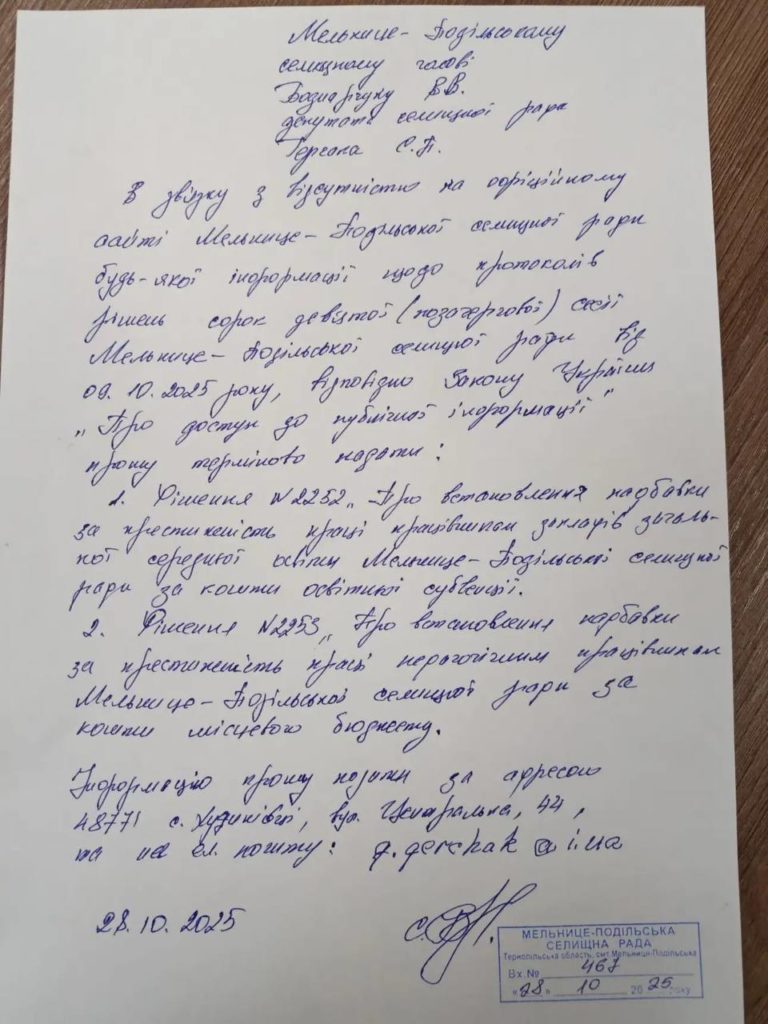 Депутат від фракції «Європейська Солідарність» Степан Герчак звернувся до голови Мельнице-Подільської громади Володимира Боднарчука з вимогою припинити порушення принципів відкритості та прозорості.