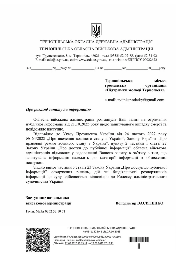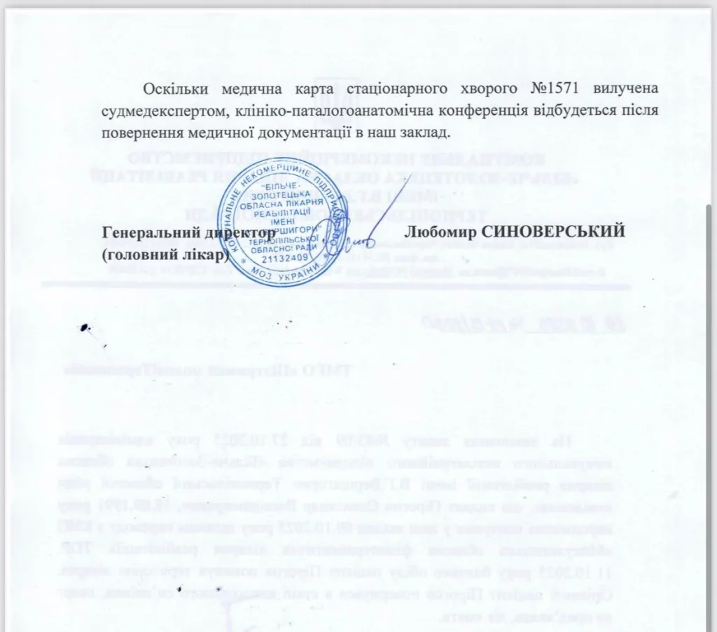 13 жовтня відбулася службова нарада під керівництвом гендиректора Любомира Синоверського, але медкарту вилучили слідчі. На запит ГО ОВА відмовила в інформації (лист № 05-11328/42 від 27 жовтня), посилаючись на воєнний стан та обмежений доступ.