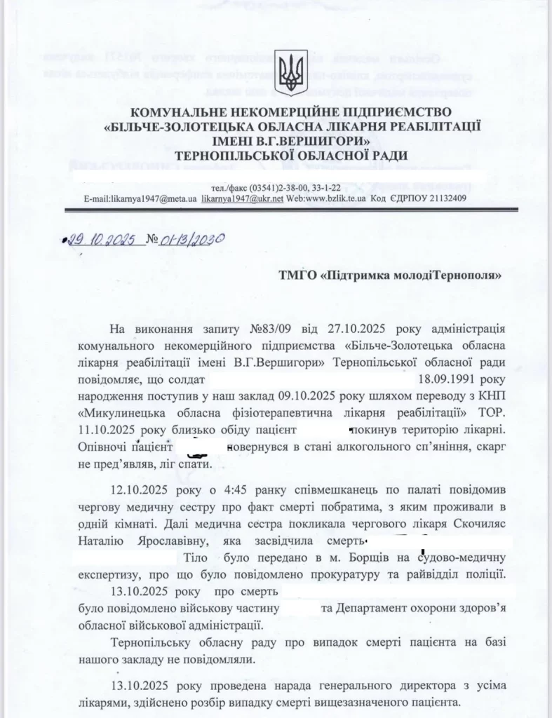 Символ Олександр П. прибув до КНП «Більче-Золотецької обласної лікарні реабілітації імені В. Г. Вершигори» 9 жовтня 2025 року. 11 жовтня він самовільно покинув територію та повернувся опівночі в стані алкогольного сп’яніння. Скарг не надходило, тож він ліг спати. О 4:45 ранку 12 жовтня співмешканець виявив, що військовий не дихає. Лікарка-чергова Наталія Скочиляс констатувала смерть.