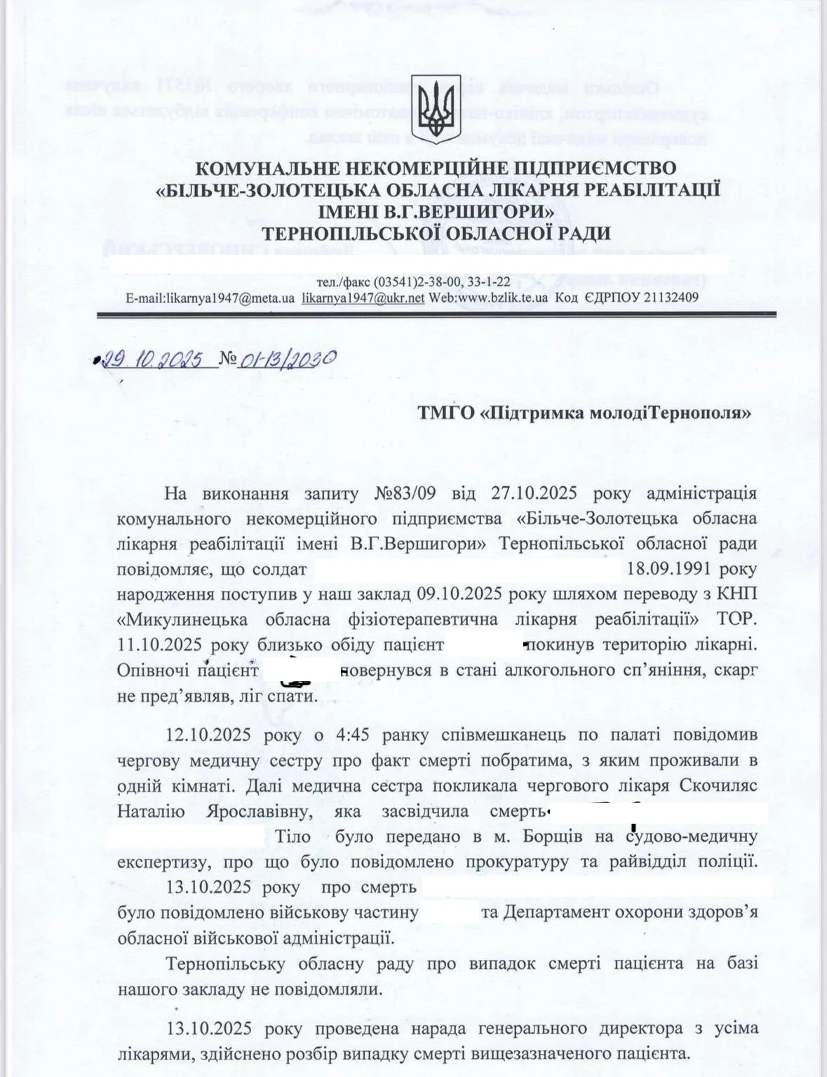У реабілітаційній лікарні Більче-Золотець на Тернопільщині помер солдат ЗСУ Олександр П., який проходив лікування після поранення. За версією закладу, загиблому передував самовільний відхід і вживання алкоголю. Тернопільська ОВА класифікувала справу як «таємну», уникаючи коментарів щодо системних проблем. Про це повідомляє сайт ТеНьюз.