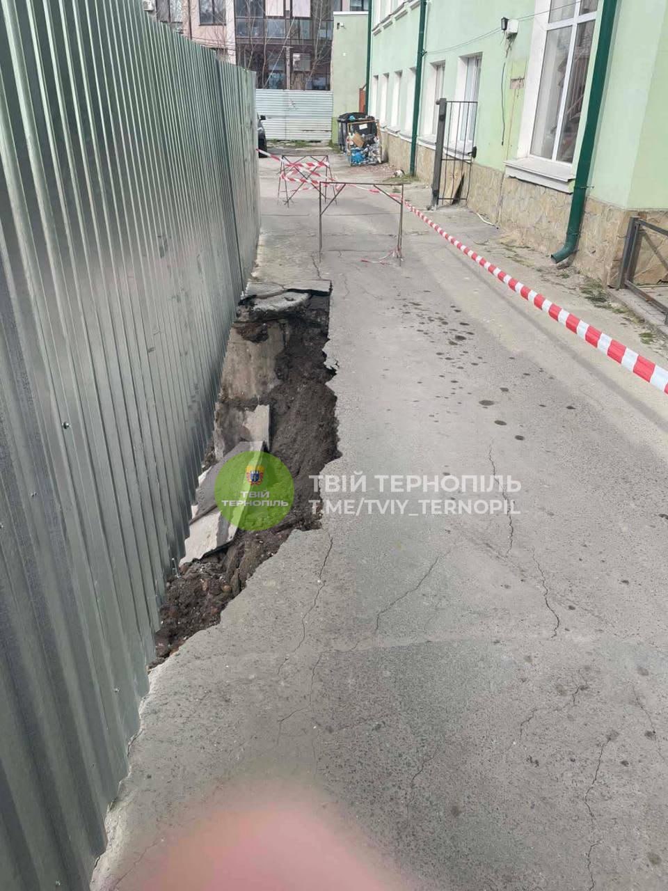 Як повідомляють очевидці, провалля продовжує збільшуватися. Асфальт сповзає у котлован, а огорожа вже частково обвалилася і падає всередину.