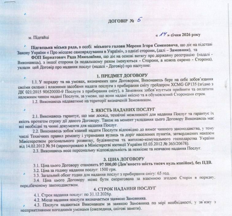 Як повідомляє спільнота «Підгайці говорять», одним із таких підрядників стала ФОП Бернатович Рада Миколаївна, зареєстрована 9 січня у Рівненській області. Уже за п’ять днів, 14 січня, з підприємцем уклали договір на прогортання доріг автогрейдером на суму 97 500 гривень.
