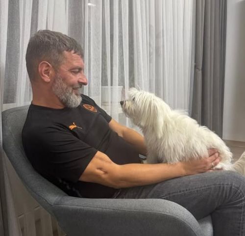 Фото, під яким з’явився новий коментар, показує Михайла Діанова вдома: він сидить у кріслі та тримає на руках білого собаку.